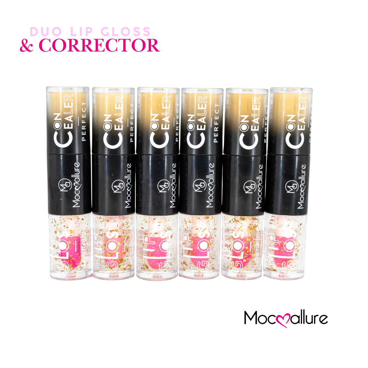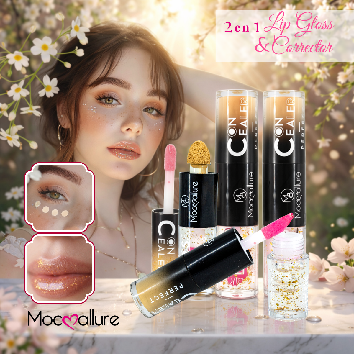 2 en 1 Lip Gloss destellos dorados + Corrector para ojeras